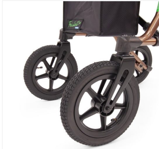 The most robust walking frame in our Freiheit freedom stroller range, the XC is designed for more adventurous individuals. For those who like to get out and about, the large 310mm pneumatic wheels and excellent stability make it easy to push the frame over rough ground, making it perfect for outdoor use. The steering dampers reduce the “flutter” of the wheels, making easy to use on rougher terrain.