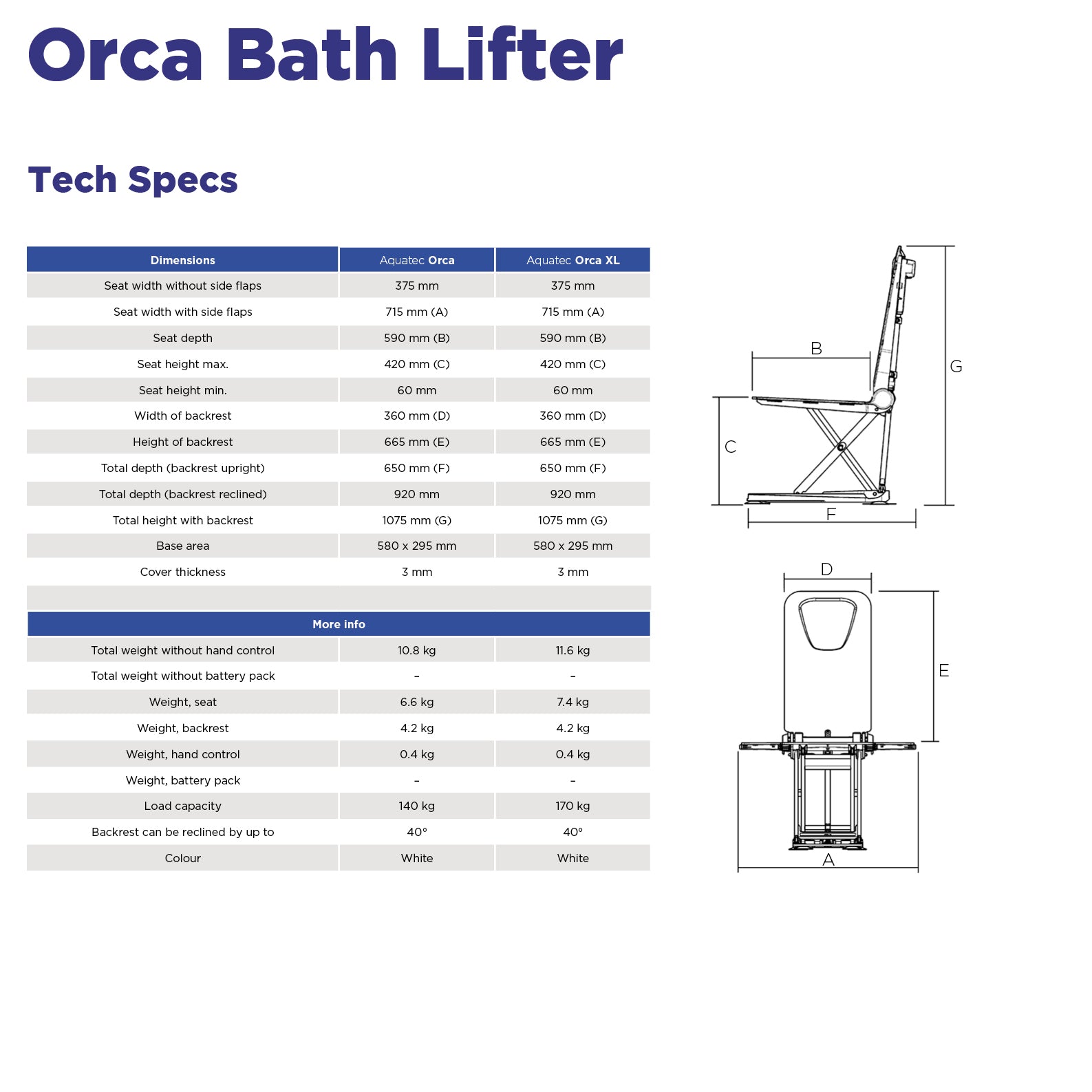 The Orca bath lift has a superior backrest recline of up to 40° and lowers down into the bathtub to aid in washing and rinsing, enhancing the user's bathing experience. The Orca bath lift is particularly versatile and can be disassembled into two parts for ease of storage, infrequent use or travel.