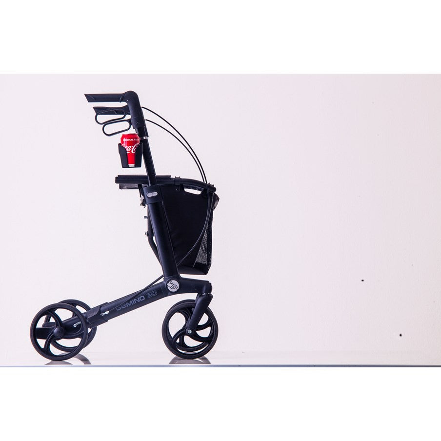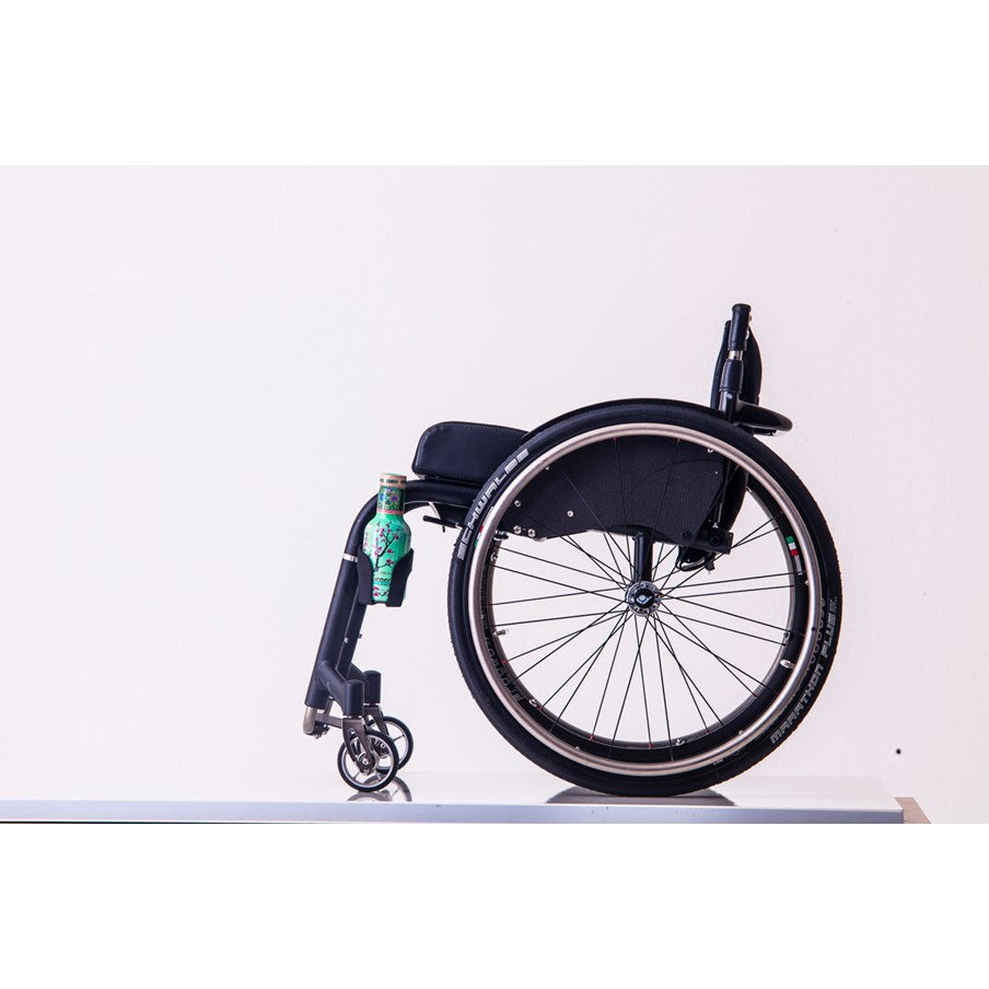 The cup holder easily attaches to the wheelchair by using a Quokka adapter. Finally, a place to put your coffee or drink while you're on the go!