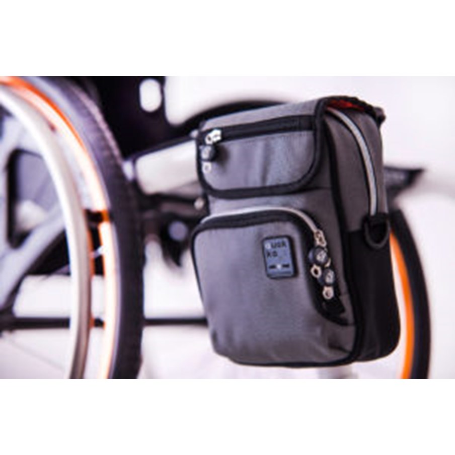 A small vertical shaped bag that fits onto your wheelchair or walker. The vertical bag comes in black and grey and features magnetic snap for easy opening and closing.