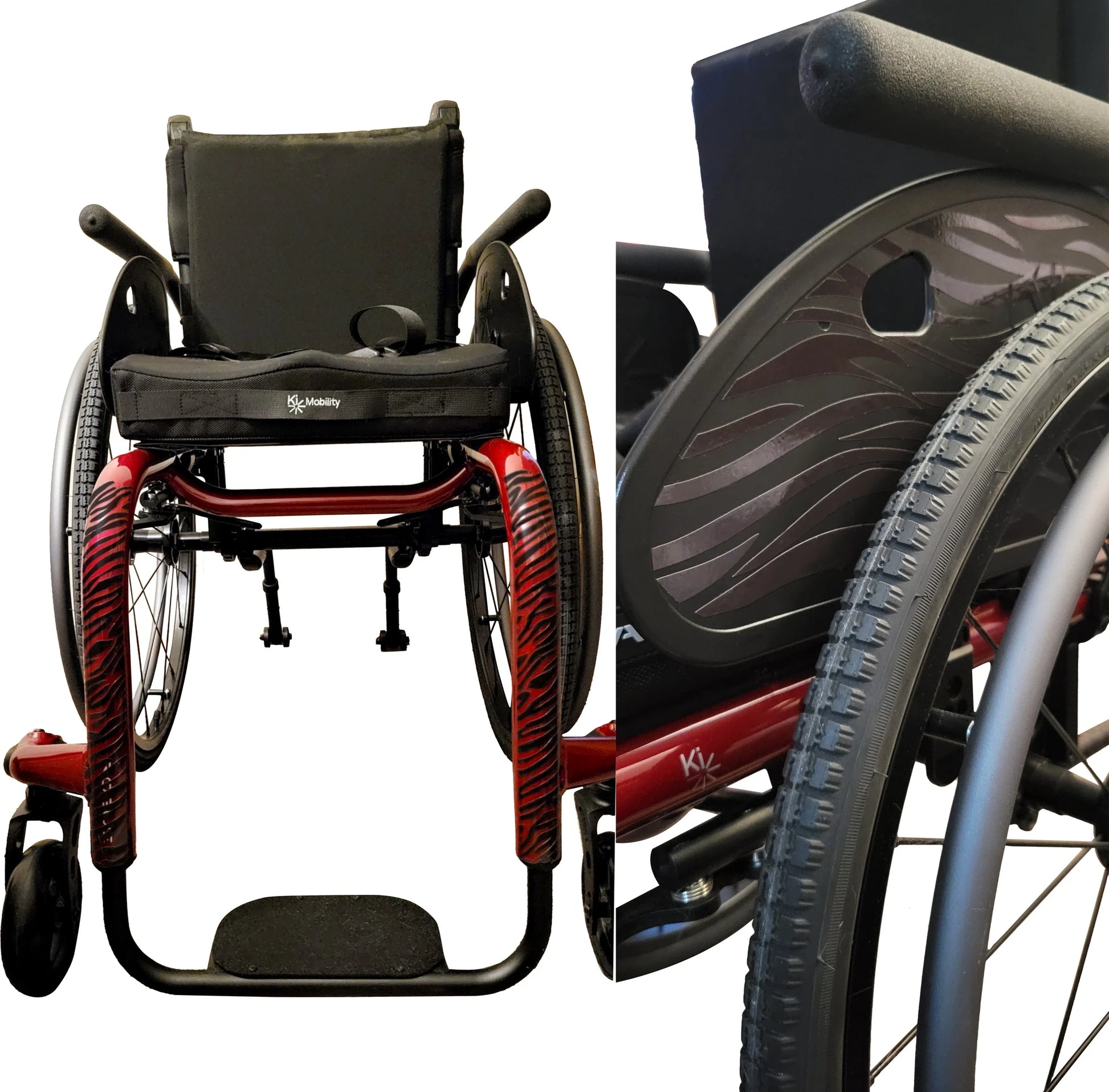 Wheelchair Skins are available in 9 beautiful colors which were designed to coordinate with RehaDesign pushrim covers, seski spokes and wheels on fire.